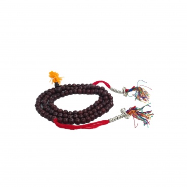 Collier tibétain, mala de 108 perles de céramique résistante couleur imitation bois, accompagné d'un pompon rouge orangé. Chacune des perles d’environ 7 mm est décorée de deux cercles l'un dans l'autre et d'un point au centre. Le mala est aussi appelé rosaire bouddhique ou chapelet . Il est l'un des attributs essentiels du pèlerin et d'un grand nombre de divinités.