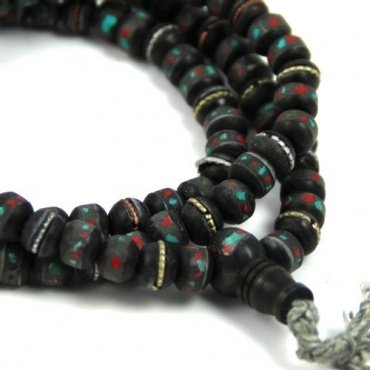 Chaque perle de ce mala est gravée de cercles concentriques faisant penser à des yeux. Le mala est aussi appelé rosaire bouddhique ou chapelet . Il est l'un des attributs essentiels du pèlerin et d'un grand nombre de divinités. Chacune des perles du mala sert à réciter des prières.