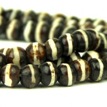 Collier mala yin yang de 108 perles de 6 à 7 mm; chaque perle de ce mala est peinte d'une vague et de points faisant penser au symbole du Yin et du Yang. Le mala est aussi appelé rosaire bouddhique ou chapelet. Il est l'un des attributs essentiels du pèlerin et d'un grand nombre de divinités. Chacune des perles du mala sert à réciter des prières
