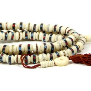Mala de 108 perles d'os blanc incrustées d'éclats de corail et de turquoise accompagnées de deux compteurs. Le mala est aussi appelé rosaire bouddhique ou chapelet. Il est l'un des attributs essentiels du pèlerin et d'un grand nombre de divinités du bouddhisme tibétain.