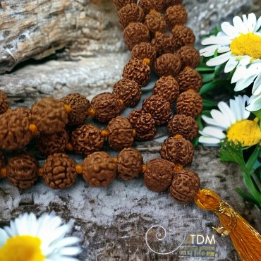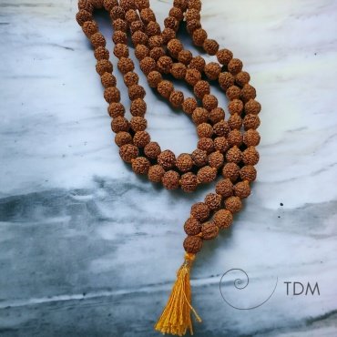 Mala de 108 perles en graine de Shiva ou Rudrakshas. Ce sont de véritables graines de rudrakshas. Chaque graine est séparée d'un noeud.Selon la légende hindoue, Shiva pris conscience de toute la misère du monde, une de ses larmes tomba sur le sol et donna naissance à un arbre qui est aussi appelé larmes de Shiva.
