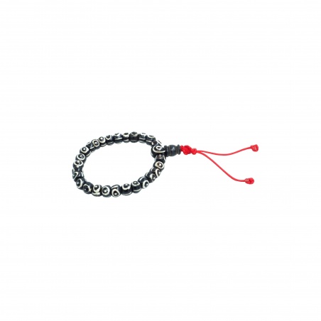 Mala bracelet en perles peintes, reliées par un cordon rouge ou noir (cela peut varier), la fermeture permet d'ajuster la taille du bracelet à tous les poignets.